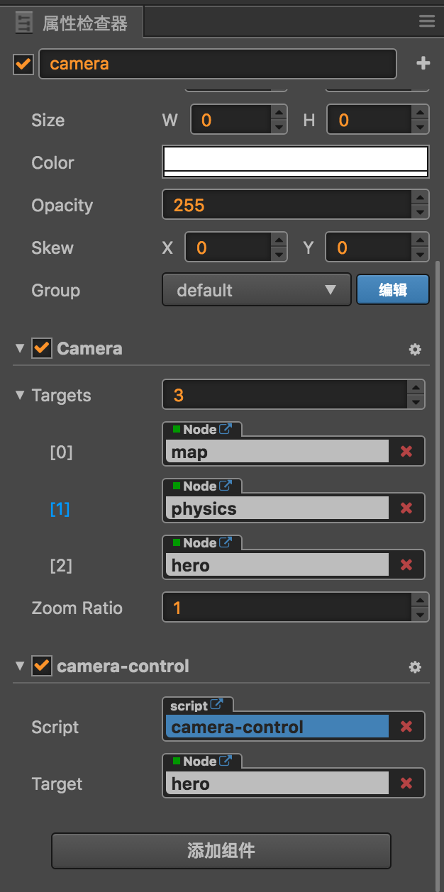 Here the camera component adds three nodes to the targets property, that is, we need the camera to shoot these three nodes. And we also added a camera-control components, the role of this component is mainly to move the camera node to follow the hero node.